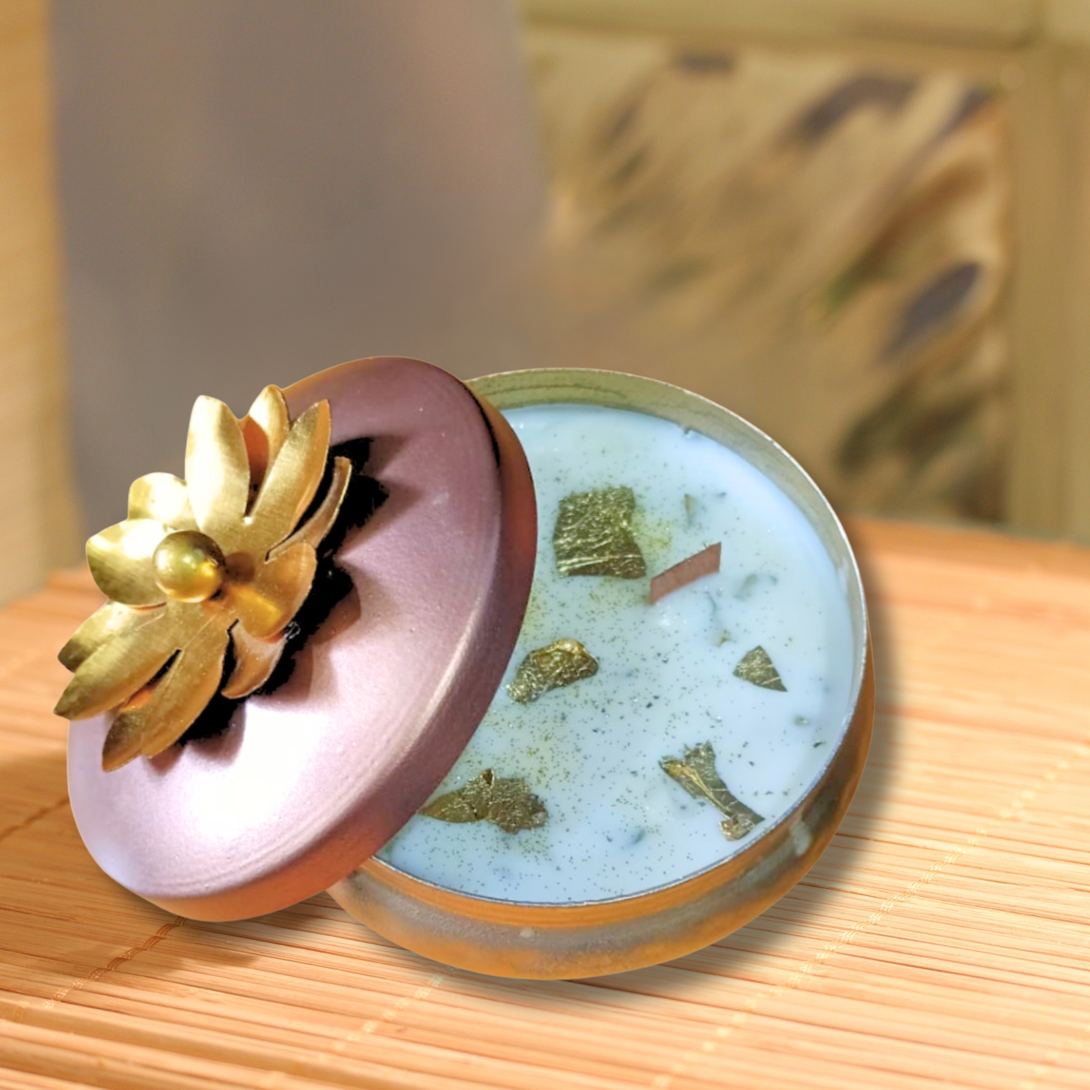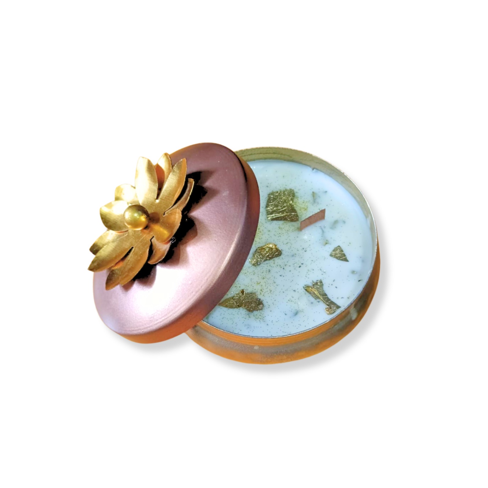 This beautiful decorative candle comes in a stylish round container with a golden floral lid, making it a perfect blend of elegance and charm. The candle is filled with smooth white wax, topped with golden flakes for a luxurious touch. It not only adds a warm glow to your space but also enhances the décor with its classy design. Ideal for gifting, home decoration, or festive celebrations, this candle creates a soothing and inviting atmosphere. Its reusable container adds extra value, making it both a decorative and practical choice for any occasion.